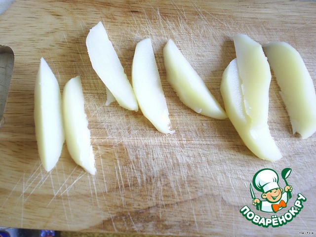6.Когда картофель сварится, воду надо слить и дать остыть. После режим картошку по-деревенски (можно и просто полукольцами).