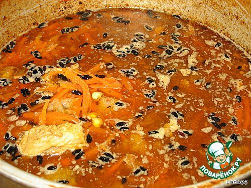 Залить кипятком, посолить и добавить молотую зиру, барбарис и замоченный с вечера нут (узбекский горох).