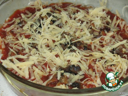 Полить вокруг оставшимся соусом. Посыпать тертым сыром и поставить в духовку на 15-20 мин.