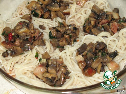 В форму для запекания вылить 1/3 томатного соуса, сверху выложить спагетти, вилкой свернуть из них гнезда. Грибную начинку выложить в гнезда.