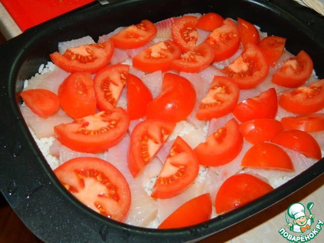 Выложить рис в смазанную маслом форму. Сверху по нему разложить порезанное рыбное филе. Посолить, поперчить...