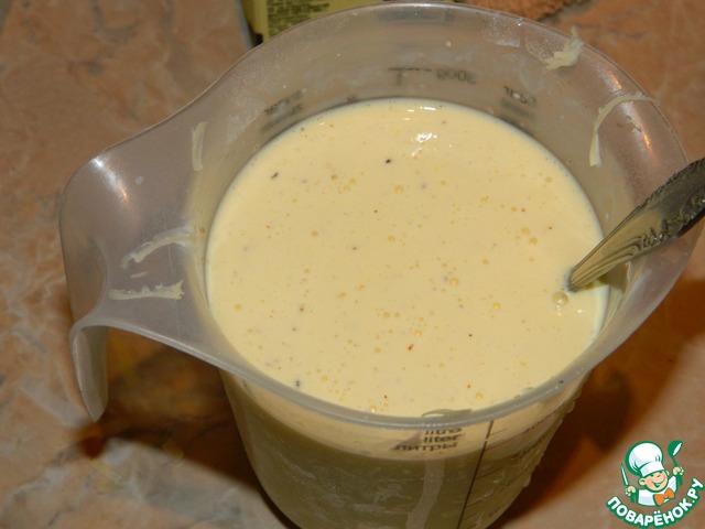 Отдельно смешиваем сливки, яйца, 1/3 натертого сыра, немного соли и перца. В этом месте можно добавить 1чл горчицы... сочетание рыбы, помидор и горчицы очень вкусно.