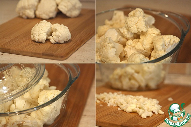 Цветную капусту разобрать на соцветия, довести до готовности и измельчить.