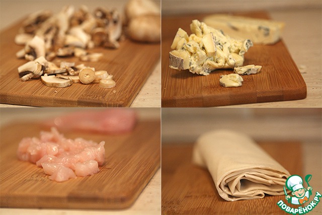 Грибы, куриную грудку и сыр мелко порезать, тесто при необходимости разморозить.