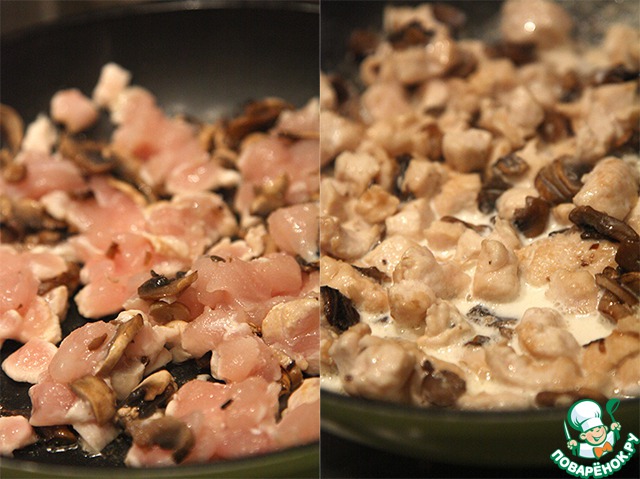 Грибы выпарить на сухой сковороде, добавить оливковое масло и куриную грудку и обжарить 5 минут. Далее посолить, добавить 100мл сливок и тушить еще 5 минут под крышкой на медленном огне.