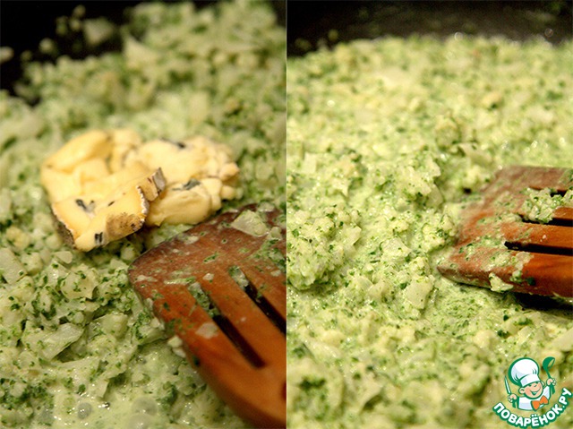 К шпинату добавить оставшиеся 20гр сливочного масла, измельченную цветную капусту, 100мл сливок и треть сыра, посолить, перемешать и тушить 5-7 минут под закрытой крышкой.