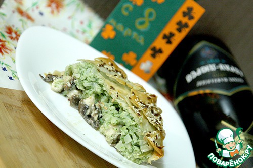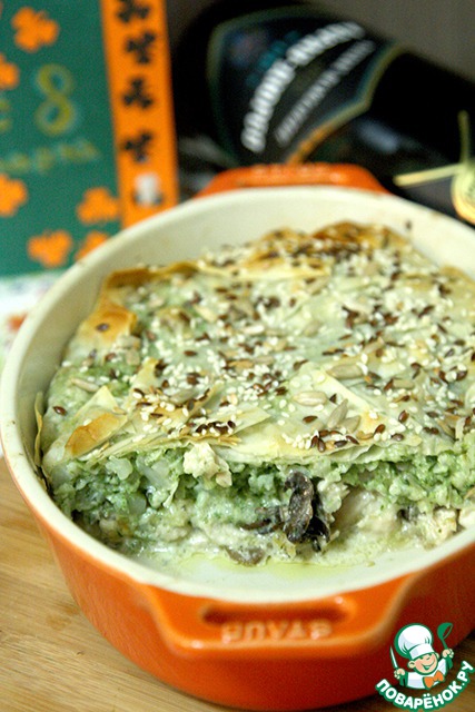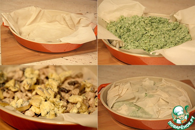 Форму выстелить половиной теста, сверху выложить тушеную с грибами курицу и оставшийся сыр. Сверху укладываем вторую часть теста, далее капусту со шпинатом и закрываем все краями теста.