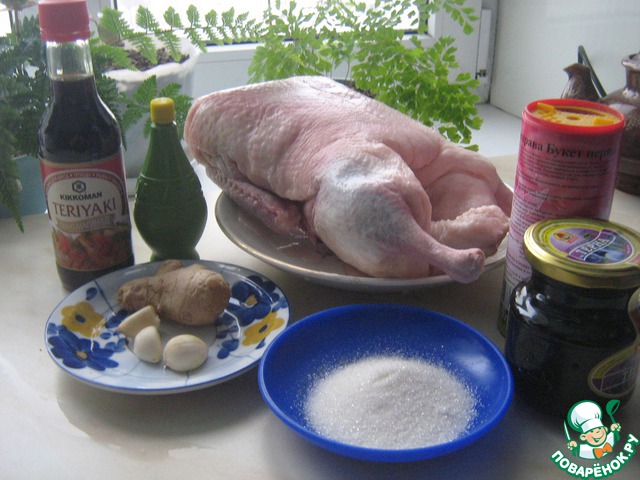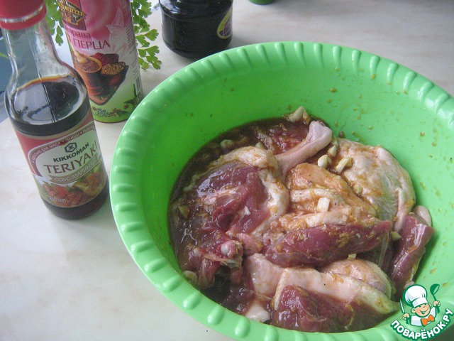 Соль, сахар, имбирь (очищенный и потертый на мелкой терке), сок лимона, соус Терияки, смесь перцев, раздавленный чеснок.
