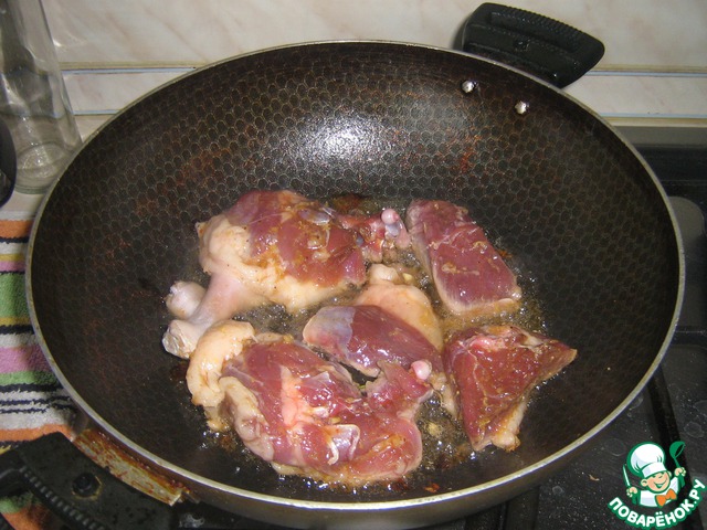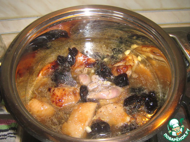 Перекладываем жареное филе в кастрюльку, выливаем остатки маринада, добавляем вареньe (главное - убедиться, что там нет косточек, а то будет неприятно потом идти к стоматологу) и заливаем нашим бульоном.