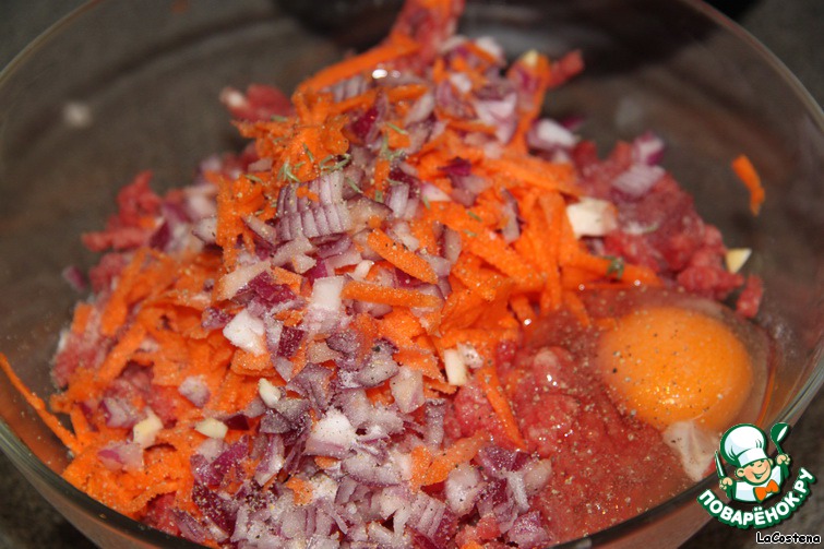 К фаршу добавим: нарезанный красный лук, натертую морковь и 1 яйцо. Соль и перец - по вкусу.