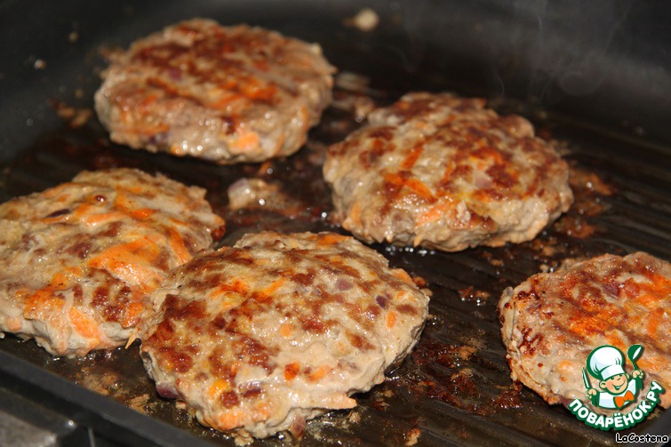 Котлеты выложить на горячую сковородку-гриль с оливковым маслом. Придавить прессом (у меня была тяжелая крышка).