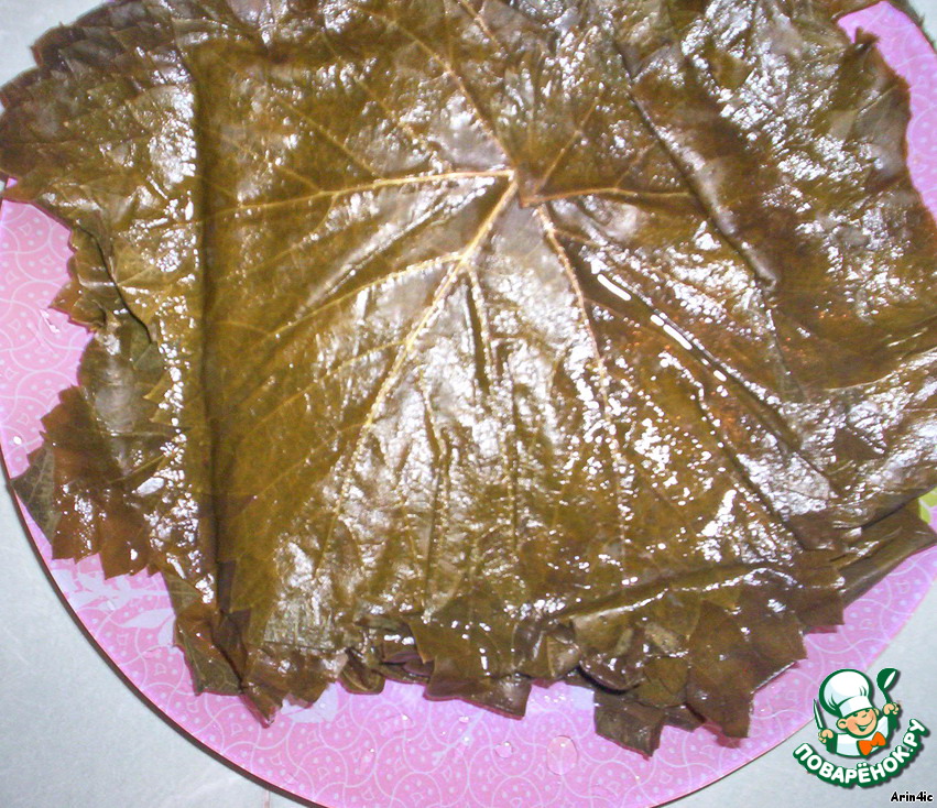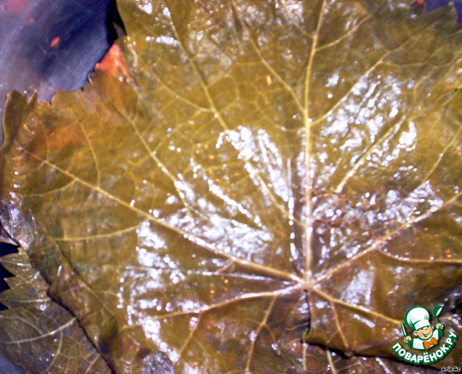 Консервированные виноградные листья купила в гипермаркете. Если у Вас будут свежие виноградные листья, то их нужно залить кипятком и заварить в течении 20 минут. Если консервированные путем соления, то нужно вымачивать в течении часа в теплой воде. У меня были просто консервированные, а они в предварительной подготовке не нуждаются. Листья капусты нужно проварить в кипящей воде.