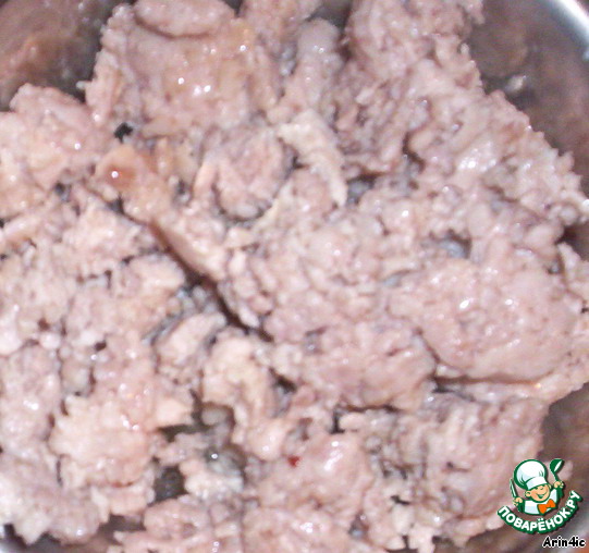 Мясо нужно использовать жирное, лучше подчеревину. Пропустить через мясорубку или мелко нарубить.