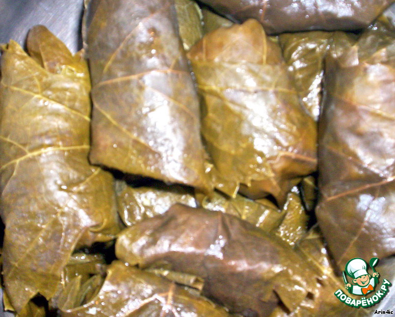 Начиняем виноградные или капустные листья начинкой. На основание листа, гладкой стороной вверх, выкладываем ложку фарша и аккуратно заворачиваем голубчик. Слегка сжать его и выложить в посуду, где будем его тушить (дно посуды предварительно выстелить виноградными листьями).