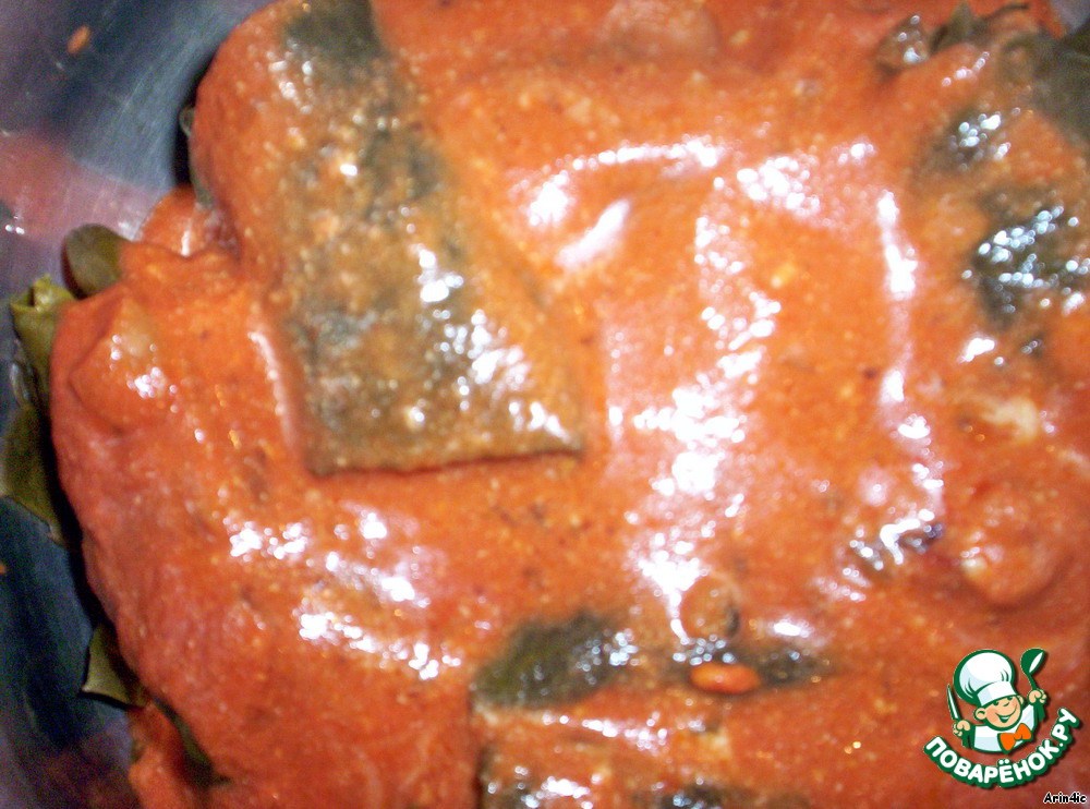Готовим соус. Натираем на крупной терке лук, затем обжариваем. Перемешиваем томатный сок, сметану, добавляем туда лук, соль и сахар по вкусу. Если готовите свежие листья, то разбавьте соус водой, в которой отваривали листья. Соус доводим до кипения.