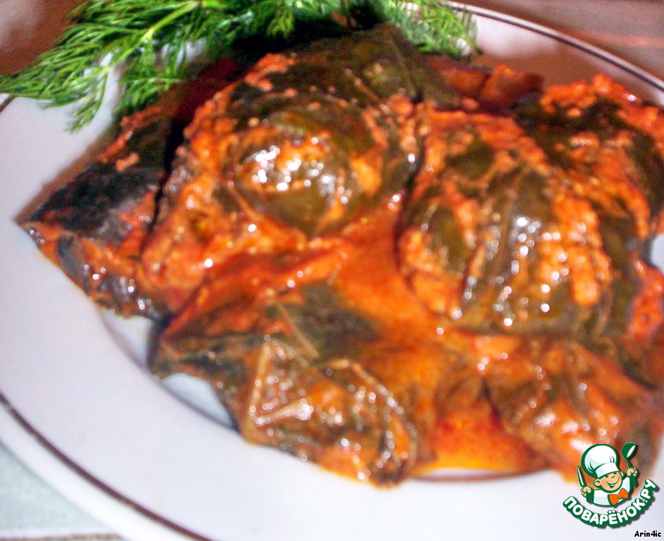 Сверху накрываем виноградными листьями, закрываем крышкой, и тушим на слабом огне 40-50 минут.
