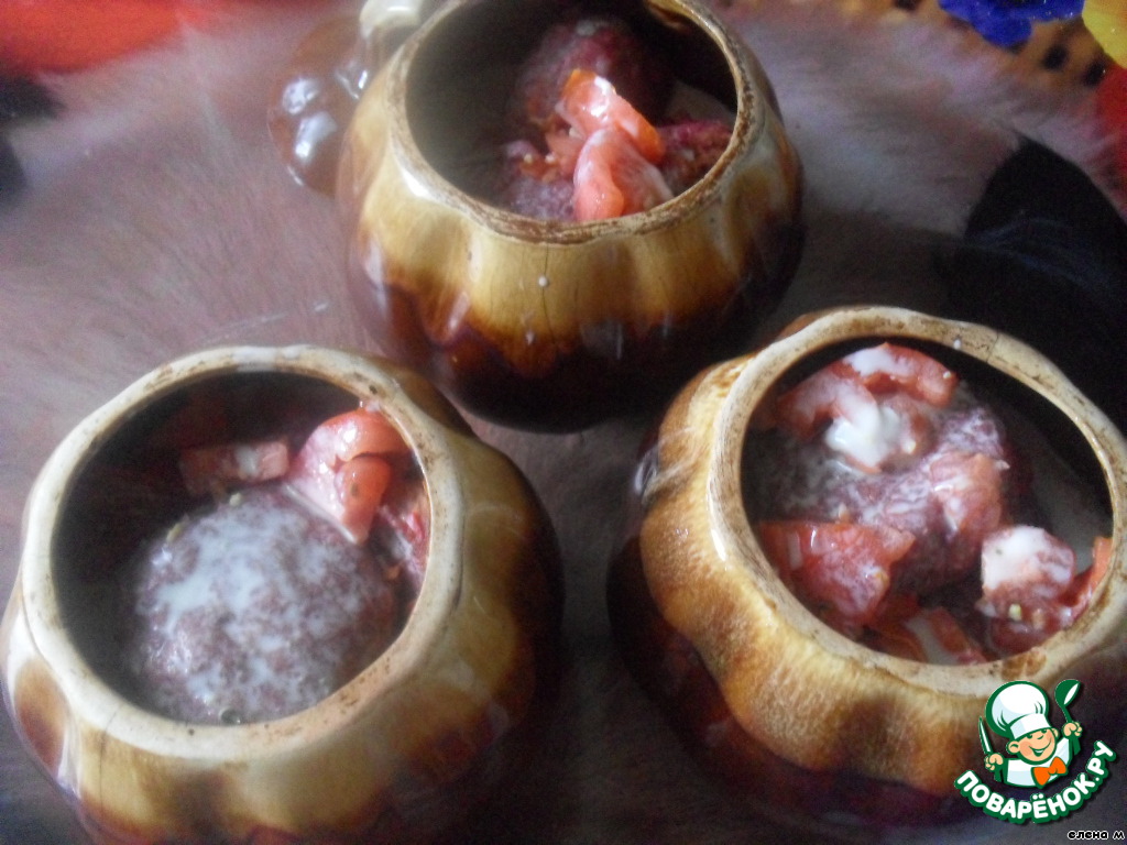 Обжаренные биточки сложить в горшочки, добавить помидор, нарезанный небольшими кусочками.