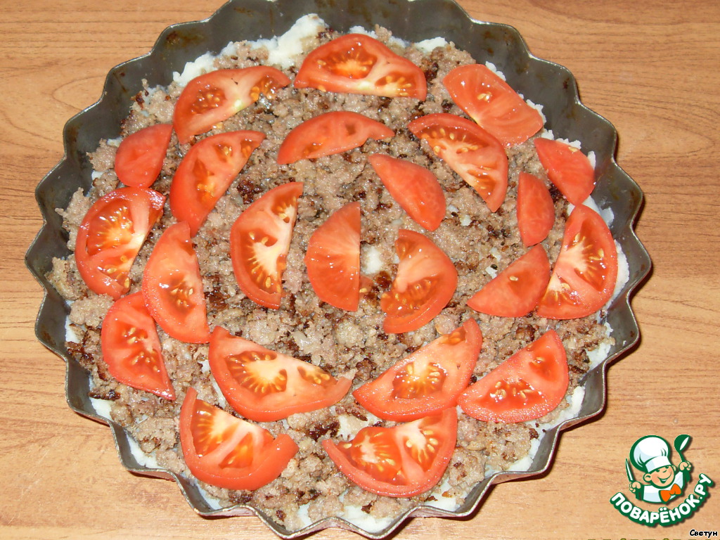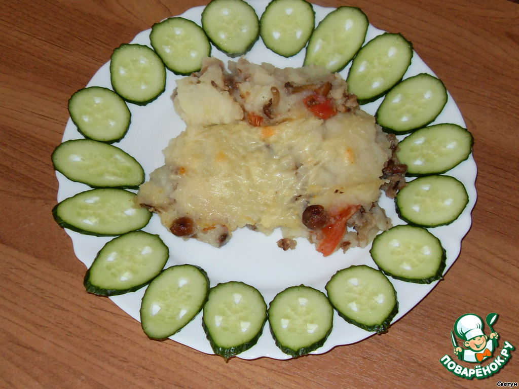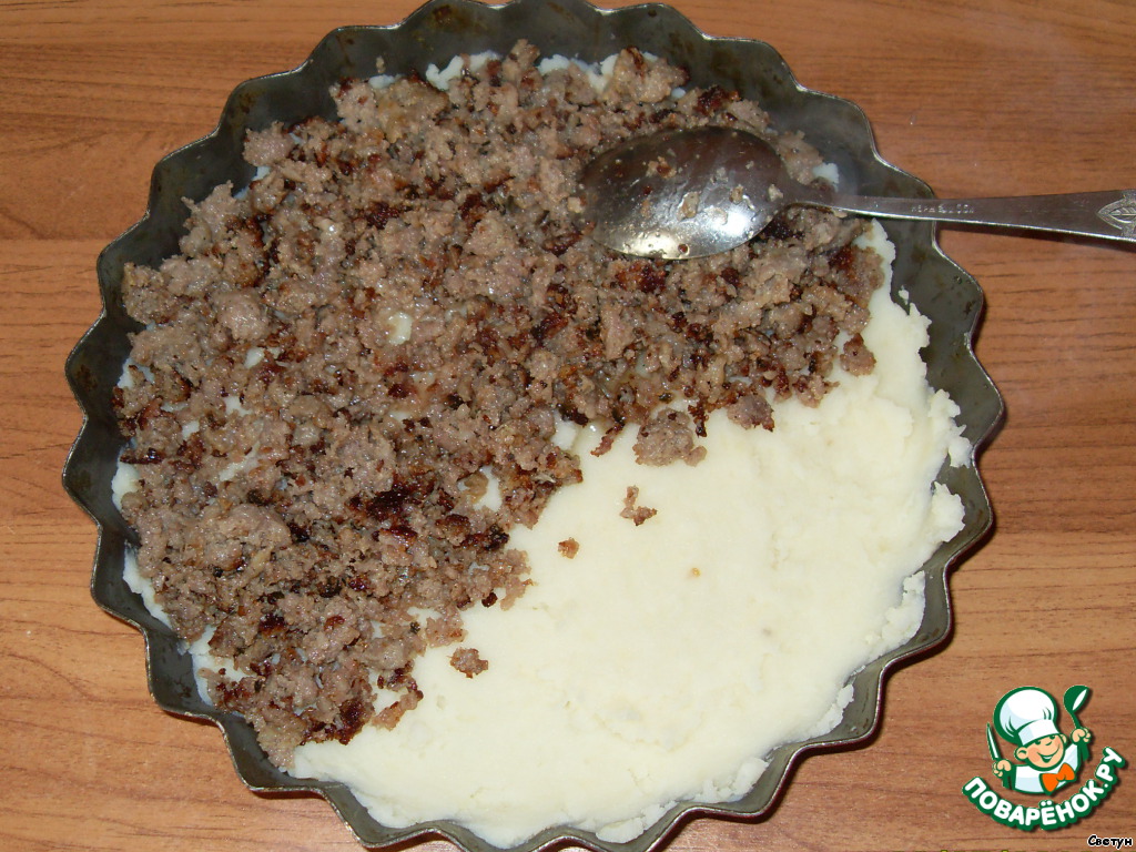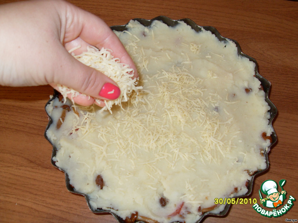 Сверху выложить оставшийся картофель и посыпать сыром.