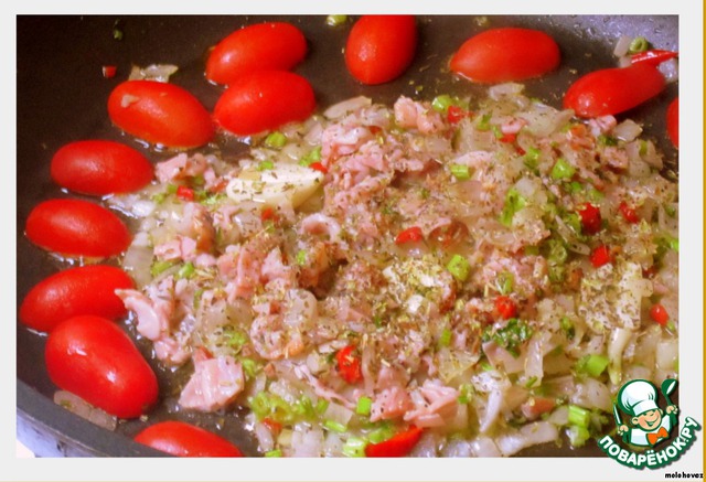 Разогреваю оливковое масло на сковороде. Добавляю туда 2 разрезанных пополам зубчика чеснока. Нарезаю мелко лук, зелень петрушки, перчик чили без семян, режу мелко ветчину и отправляю постепенно на разоретую сковородку с оливковым маслом румянится, но не поджариваться.