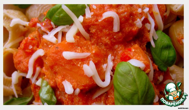 Макароны сливаю, раскладываю по тарелкам. Сверху соус посыпаю моцареллой или пармезаном. Украшаю свежими листиками базилика.
