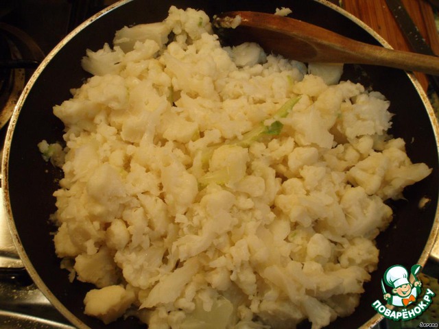 ...добавьте размельчённую капусту и посыпьте солью и перцем, накройте крышкой и пусть потомится минут пять.