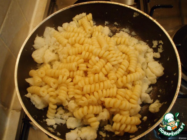 Готовые макароны выложить в сковороду на капусту и перемешать, не снимая с огня.