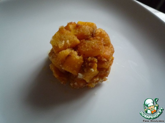 На блюдо выложить тыкву с помощью специальной формы (я использовала небольшую пиалу), тыква должна быть горячей. Посыпать посыпкой.