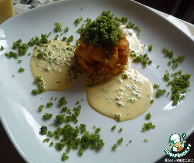 Сделать соуc. Взбить сливки до состояния сметаны. (Главное не перебить сливки). В сливки положить мелко нарезанный укроп, куркуму и чеснок пропущенный через пресс. Посолить поперчить по вкусу.