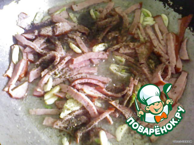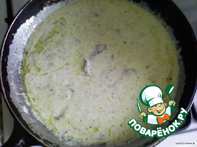 Спагетти отварить в подсоленной воде, откинуть на дуршлак и вернуть обратно в кастрюлю.