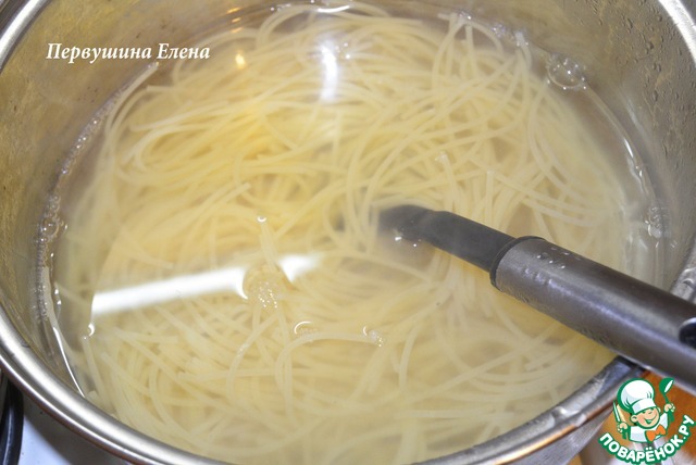 Вскипятить воду, посолить. Взять спагетти, отделить нужное количество и погрузить в кипяток. Отдельно поставить воду для креветок. Отварить спагетти «на зубок». Оставить доходить до полной готовности в горячей воде.