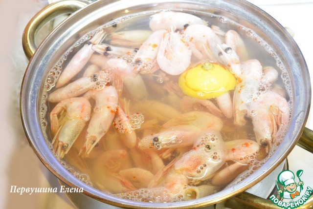 В воду для креветок добавить соль, лимон, лавр и пол пучка укропа. Довести до кипения, закинуть креветки. Снова довести до кипения и сразу выключить огонь. Слить креветки, оставить остывать.