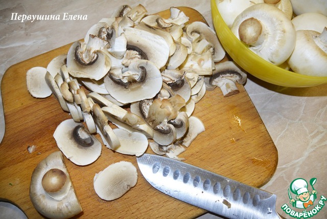 Грибы нарезать колечками, толщиной примерно в 1,5мм.