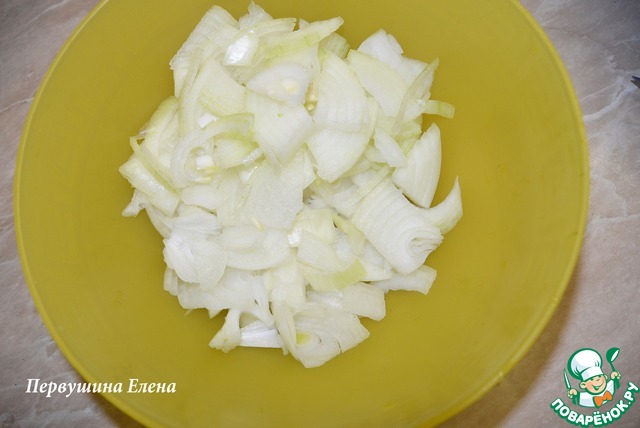 Лук разрезать пополам вдоль и каждую половинку еще раз. Нашинковать поперек толщиной примерно в 1мм. Слить воду со спагетти. И периодически их встряхивать, чтобы не слиплись.