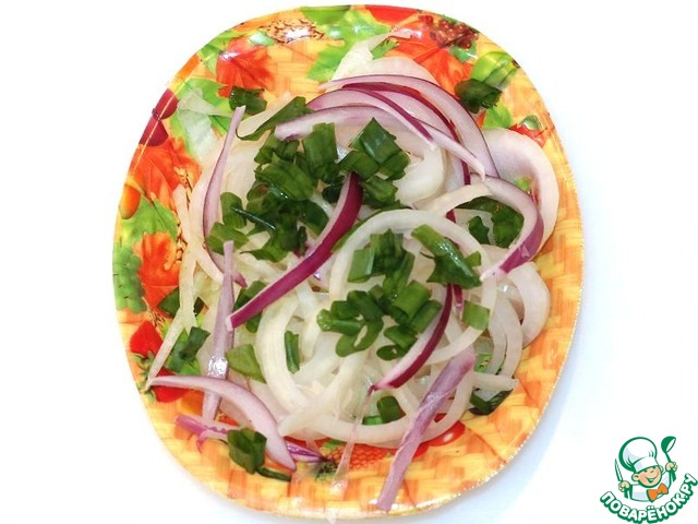 Репчатый и зелёный лук режем тонкими кольцами или полукольцами. На сковороде разогреть подсолнечное масло. Выложить лук и обжарить до золотистого цвета.