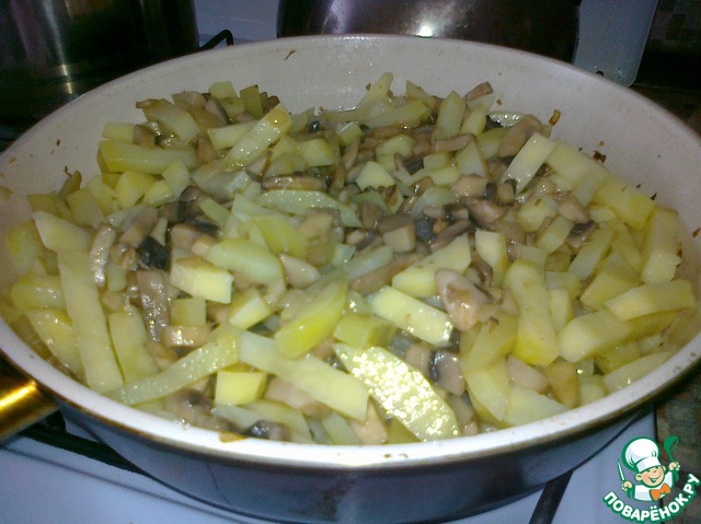 Крупно (но не очень) режем грибы и добавляем их к обжаренному луку. Сначала их может показаться много, но они сильно ужариваются. В процессе грибы пустят сок, жарим до тех пор, пока весь сок не испарится.