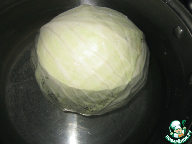 Капусту отварите в подкисленной воде до мягкости покровных листьев (предварительно капусту можно заморозить, тогда при оттаивание листья будут мягче). Кочан лучше брать поменьше (у нас в магазине маленьких не оказалось)