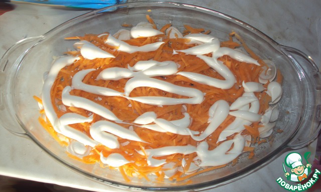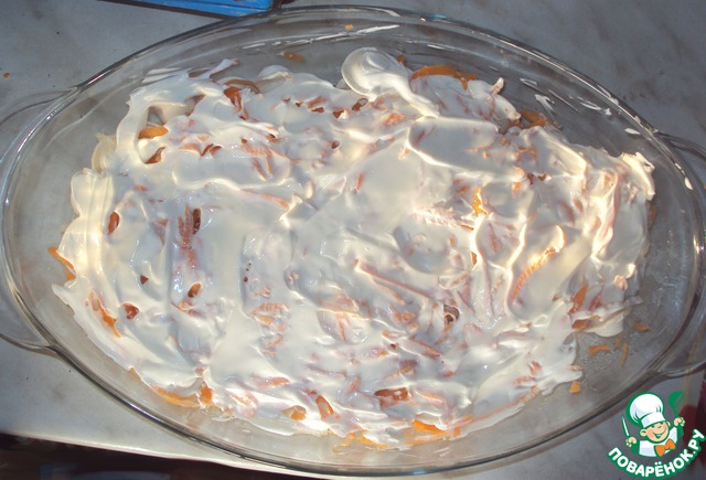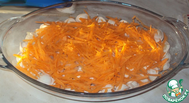 На терке трем морковь и посыпаем сверху.