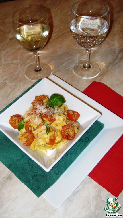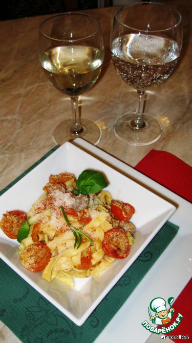 Сервировать тальятелле вместе с запеченными помидорами, украсив веточкой розмарина, листочками базилика и слегка посыпав сыром.