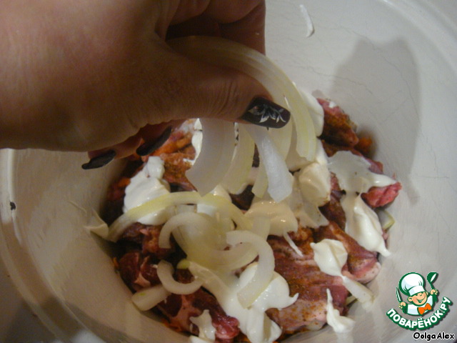 Порубить и разрезать ребра. Лук порезать полукольцами.