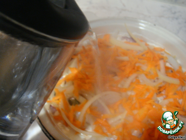 Заключительный слой - лук и морковь. Добавляем кипятка, чтобы чуть прикрыть жидкостью мясо.