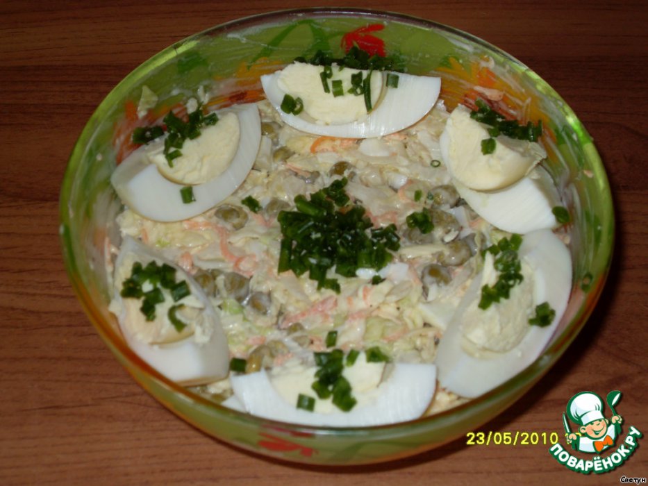 Капусту мелко нарезать, морковь натереть на мелкой терке, лук репчатый (половинку головки) мелко порезать, яйцо отварить и мелко порезать, добавить горошек консервированный. Перемешать все с майонезом и украсить по своему желанию. Очень быстрый в приготовлении салатик и очень вкусный.