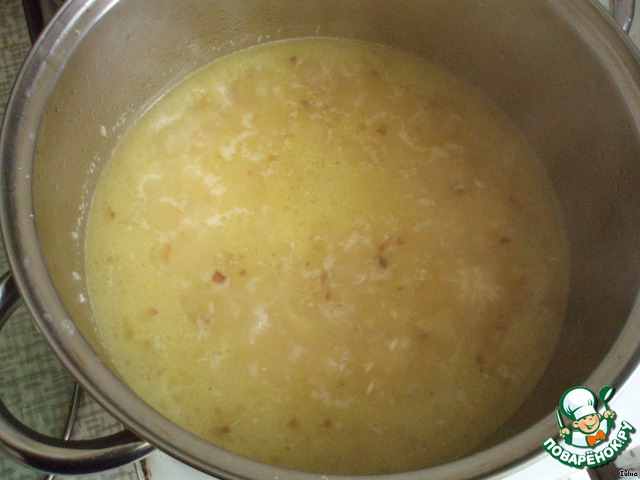 Лук мелко нарезать и слегка обжарить в большом количестве масла на дне кастрюли. Лук должен стать слегка золотистым.