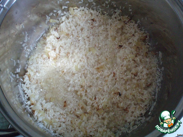 К луку добавить рис, немного убавить огонь и перемешивать до тех пор, пока рис не впитает всё масло.