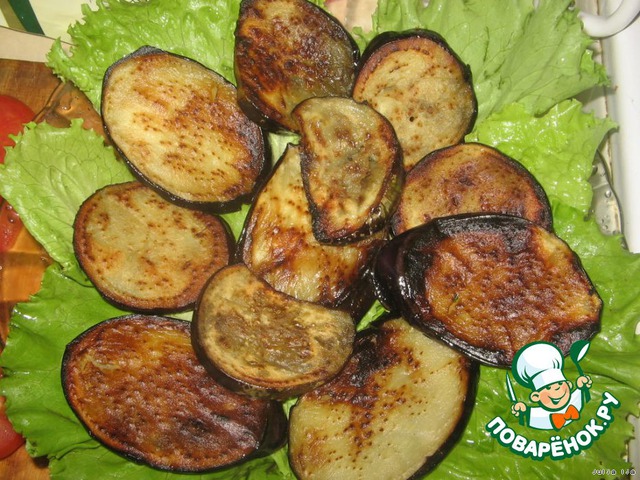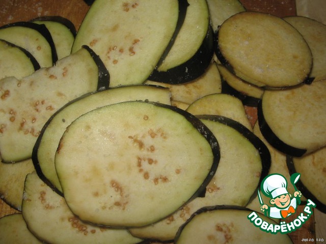 Баклажаны нарезать тонкими колечками. Слегка посолить их и оставить на 20 минут.