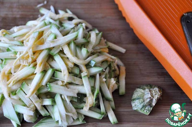 Цуккини нарезаем тонкими полосками или натираем на тёрке Бёрнер.