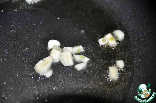 На разогретую сковороду наливаем масло, кладём мелко нарезанный чеснок.