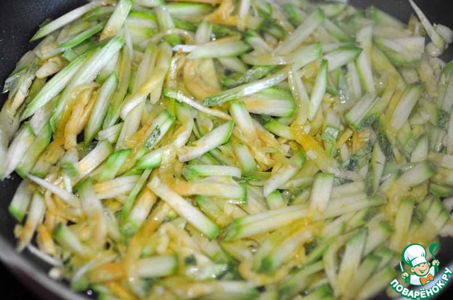 Добавляем нарезанные (натёртые) цуккини и обжариваем до прозрачности.