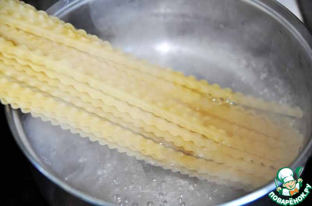 Одновременно берём тальятелле или любой другой вид пасты (макаронных изделий) и отвариваем согласно инструкции на упаковке в подсоленной воде.