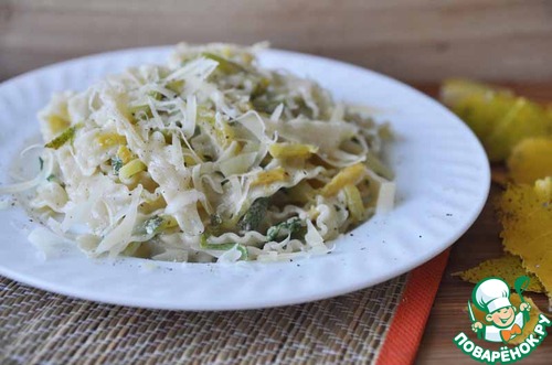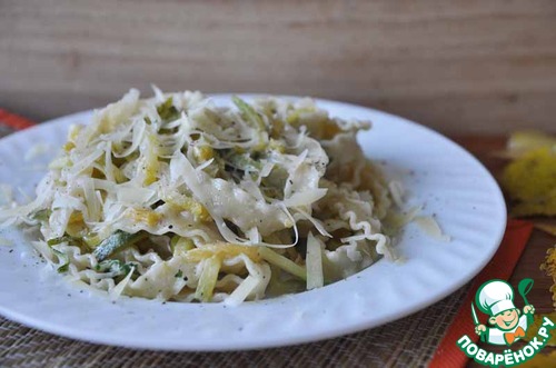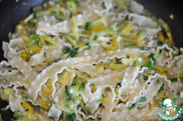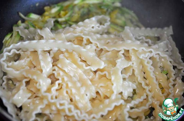 Тальятелле откидываем на дуршлаг, кладём на сковороду к цуккини. Перемешиваем.