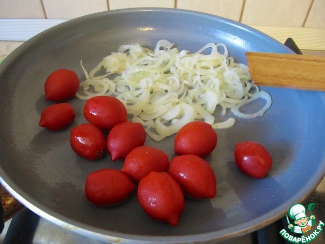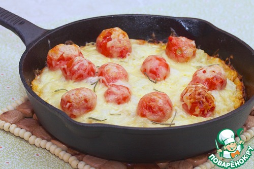Выложить обжаренный лук, помидорки, натертый сыр, выпекать в разогретой дл 180 С духовке 20-25 минут (время и температура - ориентировочные!). По желанию можно украсить пряной зеленью. Подавать горячей!